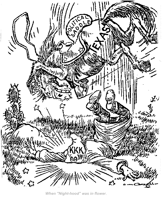One of the first big losses for the Klan came, when the Texas Democratic Convention nominated Miriam "Ma" Fergusen, wife of ex-governor Ferguson who was impeached by Klan forces, for governor and adopted an anti-Klan platform.(2)Lynch Davidson. Mrs. Fergusons opponent in the primary, saw her victory clearly as an anti-Klan victory.(3)